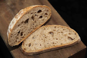 I have choosen the Huusbrot because it requires only little. I use 100% first clear flour from my house mill in organic quality, and frankly only a preferment / sponge made with my organic yeast water and just the first clear flour (Ruchmehl in Switzerland). Here i don't use a long cold fermentation, since I want to have a thin and crispy crust and an almost unnoticeable acid. The recipe is the same as the one's for Ruchbrot (First Clear Flour Bread). It has a very high water content of 80% - that is a hydration of 180% and in the processing required some practice. The result, however, makes up for the thrill: a distinctive smell and large pores. Beside all of the whole grain breads it belongs to my everyday favorites, as it has an incredibly balanced flavor with restrained acidity, which tolerates sweet and savory coverings and even after a few days is still fresh. Been baking or grilling also a treat. Those who enjoy good First Clear Flour or Ruchmehl, I can only encourage you to give it a try.